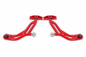 A-arms are one of the most important, yet overlooked suspension components. They are the direct link between the front wheels and the chassis. Any deflection causes a change in alignment, which results in poor performance and driving feel. Fabricated from heavy-duty 1.25-inch, 0.120-inch wall DOM tubing, deflection is eliminated with A-arms from BMR Suspension. BMRs AA757 Lower A-arms are equipped with greasable heavy-duty ball joints, greasable Delrin bushings (rear mount) to handle the high loads, and zinc-plated, X-series, heat-treated, chrome-moly, self-lubricating, Teflon-lined rod ends for loads of adjustability. Solid mounts give you a more responsive feel over the stock rubber bushings. BMRs bushings allow grease to evenly coat the inner sleeve. This efficient lubrication ensures quiet, reliable operation over the life of the bushings. The combination of rod ends and Delrin bushings gives you improved steering feel and responsiveness for any for of driving. Based on our well proven traditional A-arm design, these Handling A-arms feature -inch taller ball joints to raise the roll center height on lowered vehicles for improved handling.BMRs AA757 lower A-arms eliminate A-arm deflection, greatly improving steering feel and response in normal and performance driving situations. The rod ends and Delrin bushings add strength and reduce deflection over the stock rubber bushing. The means you get great performance. Designed for street performance, drag race, and handling, and pro-touring applications, BMR lower A-arms are engineered to give you improved geometry and increased lateral grip during cornering situations.BMR Suspension AA757 Adjustable Lower A-arms are available in black hammertone and red powdercoat for long-lasting good looks. Installation time is 3-4 hours. Proudly made in the U.S.A.Control arm hardware kit RH014 (Includes upper and lower control arm hardware - Highly Recommended) also available.