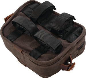 The Burly Brand Handlebar Bag is a universal fit bag that can mount just about anywhere but finds itself at home on most T-Bar handlebar setups. Offered in their proprietary Dark Oak Wet Waxed UV treated cotton canvas that will age and show character over time. Two exterior zipper pockets with generous interior space and elastic pockets feature YKK zippers secured with an Anti-Flail Snap System in. to keep everything in the bag secure.Mounts via 4 Velcro securing straps and MOLLE system.