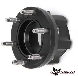 Our race winning Camburg 3.25 rear hubs are the ultimate rear hub setup for race trucks and serious PreRunners. These are what we use on all our KINETIK 7200/6100/TT’s. They are only available in the larger 6 on 6.5? racing bolt pattern with 36 TT spline or 40 spline drive plates. Our 3.25 lightweight rear hub design has a wide bearing spread for increased strength and longevity. We also use larger 8? round material for the hub body for increased strength around the wheel stud area. We CNC machine the hubs in-house from more expensive and stronger 7075-T6 aluminum, then type II anodize them matte black. Our wheel studs are also machined in-house from 4340 chromoly, then heated-treated, stress relieved and black-oxide coated. They have 5/8-18 threads with an 11/16 shoulder for optimum strength. The tapered hub-centric center caps help get the wheels on when you’re out on the race course where time is critical. We supply them with high quality Timken bearings and races along with National seals that utilize our bolt-on stainless retainers for added protection and retention. Our drive plates are machined from 4340 chromoly, broached, heat-treated, stress relieved and nickel plated gray for corrosion resistance. Our red brake rotor adapters round out the package with all the necessary hardware, O-rings, etc. and bearing preload spacers. Simple things like drilled head bolts to safety wire the brake rotor adapters on, show the attention to detail with our hub kits that you don’t get from other companies. We cut no corners or costs using the best materials, designs and processes. To complete this setup you’ll need our weld-in spindle snouts and our custom spindle nut wrench.