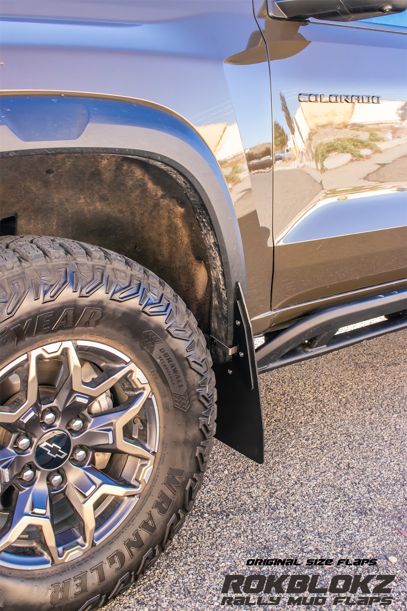 Upgrade your 2023 Chevrolet ZR2 Colorado's style and protection with RokBlokz Rally Style Mud Flaps. Tailored specifically for your vehicle, these durable mud flaps are designed to withstand the toughest conditions, from gravel roads to muddy off-road trails. Easy to install and available in various colors, RokBlokz mud flaps not only enhance the rugged look of your truck but also safeguard it against chips, cracks, and rust. Upgrade your ride with the perfect blend of performance and aesthetics, and tackle any adventure with confidence. Choose RokBlokz for unmatched protection and style!