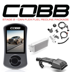 The Stage 2 + CAN Flex Fuel Power Package includes an Accessport V3, Carbon Fiber Intake System, Factory Location Intercooler (Silver), CAN Flex Fuel Upgrade and a COBB Vehicle Badge for your Raptor 2017-2020.