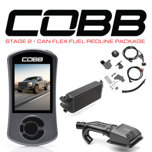 The Stage 2 + CAN Flex Fuel Power Package includes the TCM Accessport V3, Carbon Fiber Intake System, Factory Location Intercooler (Black), CAN Flex Fuel Upgrade and a COBB Vehicle Badge for your Raptor 2017-2020.