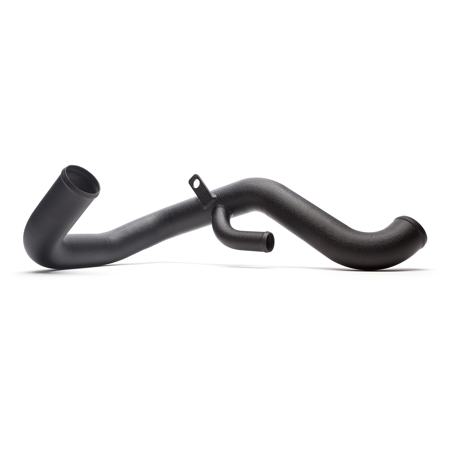 As with all intercooler hard-pipe kits, the stock rubber hoses to the intercooler are replaced with solid pipes to eliminate distortion under boost. But the devil is in the details, and that is where similarities end. The COBB EVO X Hard-Pipe Kit consists of single piece pipes made from mandrel bent aluminum tubing on both the cold side and hot side of the intercooler. The results are weld-free pipes from the turbo outlet to intercooler inlet and from the intercooler outlet to the throttle body, without unsightly mid-pipe silicone hose couplings that can disrupt flow or potentially blow off under boost. The hot and cold pipe diameters are increased from the stock 2.375" to 2.5", enhancing flow even further. The By-Pass-Valve (BPV) gets its own hard-pipe from the cold side of the intercooler, maintaining the factory location and orientation. Maintaining this connection from the cold side ensures that cool air is fed back to the intake system when the valve is in bypass mode, preventing overheating of the air charge post turbo. The BPV is located using a unique COBB logo bridge that connects the BPV hard-pipe to the hot side hard-pipe. The COBB EVO X Hard-Pipe kit is one of the very few that will fit with the factory air box in place (or the optional COBB SF Intake) as well as the stock front engine cover. The kit is completed with high quality COBB silicone hose couplings and heavy duty T-Bolt hose clamps to eliminate those embarrassing hose blow-offs than can occur when demanding the most from your EVO X.