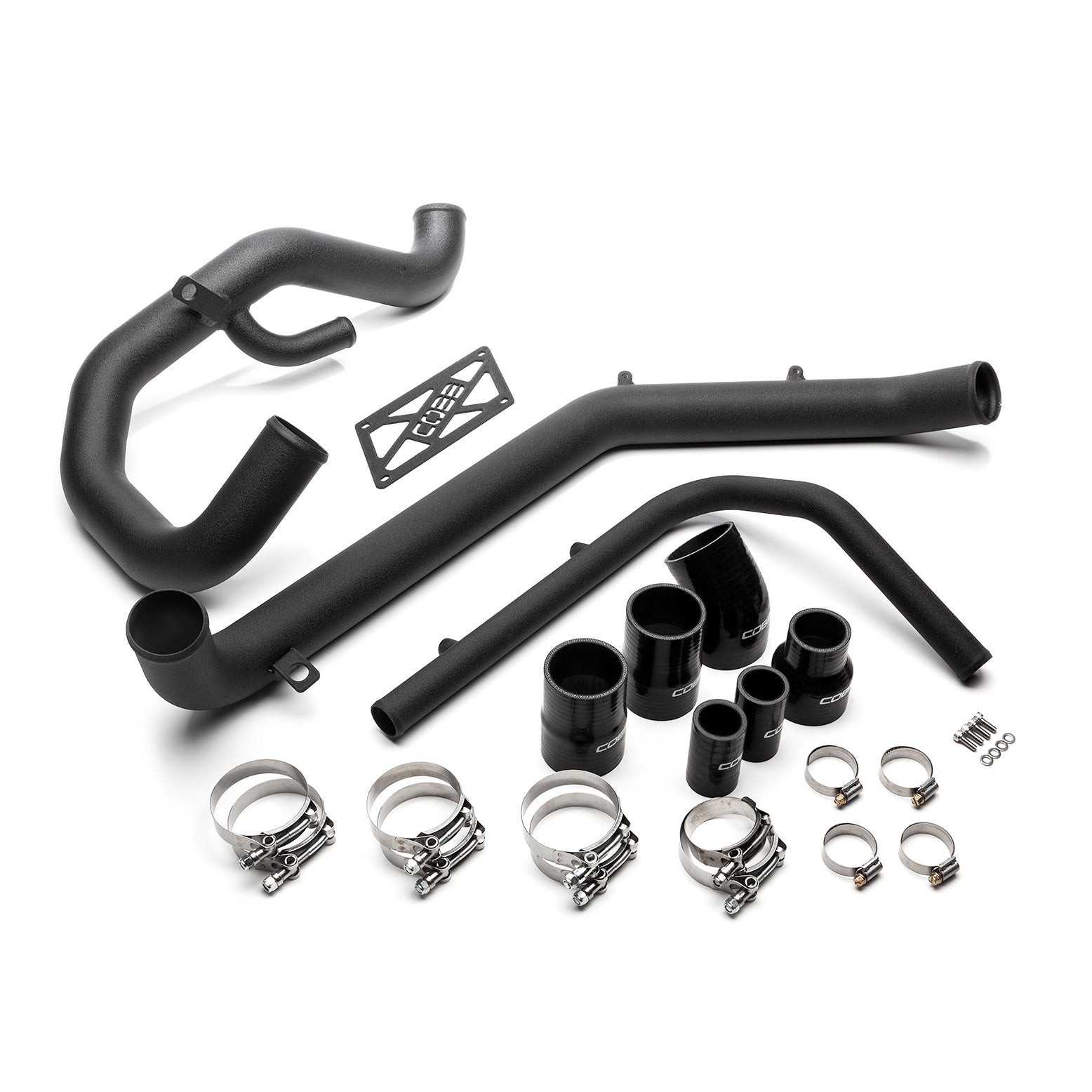 The revised COBB Intercooler Hard-Pipe Kit now comes in two great looking powder coated finishes and now fits on GSR, MR and MRT models! This kit replaces all intercooler pipes (including the BPV pipe) with weld-free single-pipe aluminum tubing. This uncompromising kit has the most comprehensive list of performance enhancing features available. Add the precision fit and one-of-a-kind appearance and it is clear that the COBB Intercooler Hard-Pipe kit for the EVO X is unequaled.
