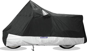 Deluxe heavyweight all-weather cover from CoverMax®. Top made of water-resistant 420-denier 100% polyester, with PU coating. Bottom is made of 65/35 polyester/cotton mix with heat- resistant, PU coating. Waterproof heat-sealed seams. Improved vents remain open at all times. Sewn-in grommets for improved attachment of anti-theft devices. Sewn-in soft windshield liner. Elastic cords sewn into bottom for a snug fit.