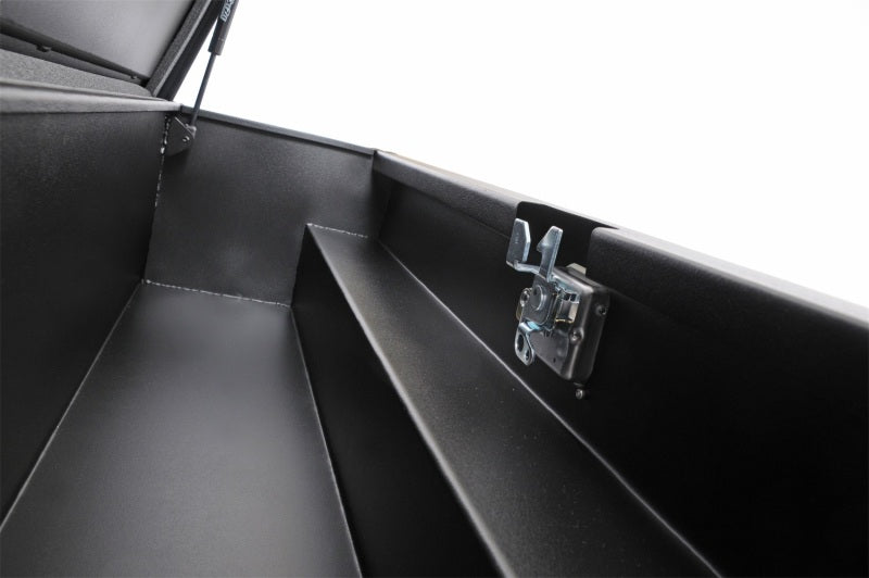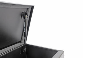 Dee Zee Tool Box - Hardware Series Side Mount Boxes. Constructed of durable 20-gauge steel. Protected by texture black NRT(TM) (No Rust Technology) rust inhibitor powder coat finish. Crown style lid with a full pan double-V stiffener for superior rigidity. Other features: lockable stainless steel paddle handles, dampened gas shocks, closed cell foam gasket, and self-adjusting strikers.