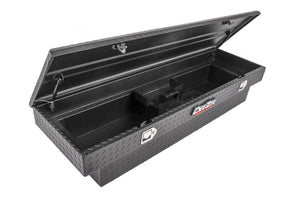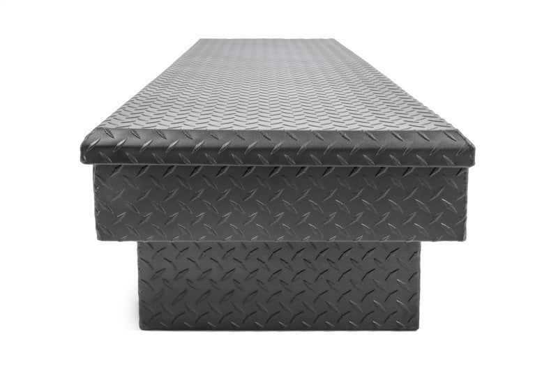 Dee Zee Tool Box - Red Label Single Lid Crossover. Constructed of heavy duty Brite-Tread aluminum with low profile design. Texture black powder coat, provides a matte black finish while it protects and prevents oxidation. Crown style lid with a full pan double-V stiffener for superior rigidity. Other features: lockable stainless steel paddle handles, dampened gas shocks, closed cell foam gasket, and self-adjusting strikers. Removable plastic tool tray to help keep small items organized.