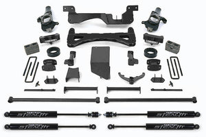 Our 6in system for 2001-10 GM HD's has been designed to provide superior suspension performance for daily driving or for offroad. This is accomplished using our proven one piece lower control arm crossmembers and extended length steering knuckles with a multitude of shock absorber options. The 1/4in thick arched lower control arms crossmembers include an integrated front differential skid plate, crossmembers support tubes and rear impact struts to distribute front suspension impact loads through the frame evenly. A new knuckle design was introduced in 2007 with this system that provides reduced track width to keep the tires under the fenders. This system also includes torsion bar drop mounts, extended length sway bar links with urethane bushings, front and rear bump stop brackets, and rear blocks.