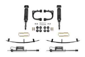Obtain increased wheel travel with a mild lift height with this heavy duty Upper Control Arm systems. The tubular Upper Control Arms feature 1.25? OD, .120? wall thick chromoly tube construction with 1? diameter Stainless Steel Uniballs that attach to the factory spindle without drilling. The replacement UCA?s have been designed to work in conjunction with Fabtech?s Dirt Logic 2.5 Coilover shocks providing 10? of wheel travel for a complete front suspension system upgrade. A rear three leaf spring pack enhances the factory leaf springs by eliminating the stiff lower overload leaf. This allows for more flexibility and travel while enhancing the ride quality. Front stainless steel Dirt Logic 2.5 Coilovers with Eibach springs provide 10? of wheel travel for aggressive offroad use. The rear Dirt Logic 2.25 shocks will also provide 10? of travel due the remote reservoir allowing for the full stroke of the shock.