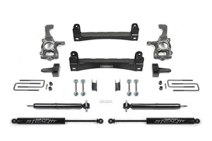 This system feature Fabtech?s proven IFS technology with extended length ductile iron steering knuckles for proper Ford electronic stability control functionality. Heavy duty 1/4? thick steel lower control arm crossmembers provide superior ground clearance for adventurous offroad trails. Rear lift is accomplished with a 2.25? lift block and extended length u bolts. The Basic System includes front coilover spacers that utilize the factory Coilover shocks for a stock like ride characteristic. Rear Stealth monotube shocks are included. This high quality system does not require drilling or cutting for installation and comes Fabtech?s 5/60 Powertrain warranty. 1/4? thick steel lower control arm crossmembers are arched for maximum ground clearance. Four adjustable alignment cams provide a wide range of adjustment. The fully welded box design of these crossmembers provides additional strength to the front suspension. Extended length ductile iron steering knuckles retain near stock track width keeping the tires under the fenders. These steering knuckles are designed to work in conjunction with the Ford ESC for proper functionality at all speeds. The Brake Line Brackets reposition the factory Ford brake lines down on the frame for the new travel range without having to open the brake system. Keeps factory fluid system intact. 1/4" thick steel drop brackets reposition the front sway bar for the increased ride height. This allows the sway bar link ends to fully cycle without binding throughout the extended travel range. 2.25" Tall rear lift blocks replace the factory blocks without changing the ride quality or load carrying capacity. American made U Bolts that retain the entire rear differential to the vehicle. A critical part that demands the best quality for your vehicle.