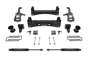 This system feature Fabtech?s proven IFS technology with extended length ductile iron steering knuckles for proper Ford electronic stability control functionality. Heavy duty 1/4? thick steel lower control arm crossmembers provide superior ground clearance for adventurous offroad trails. Rear lift is accomplished with a 2.25? lift block and extended length u bolts. The Basic System includes front coilover spacers that utilize the factory Coilover shocks for a stock like ride characteristic. This high quality system does not require drilling or cutting for installation and comes Fabtech?s 5/60 Powertrain warranty. 1/4? thick steel lower control arm crossmembers are arched for maximum ground clearance. Four adjustable alignment cams provide a wide range of adjustment. The fully welded box design of these crossmembers provides additional strength to the front suspension. Extended length ductile iron steering knuckles retain near stock track width keeping the tires under the fenders. These steering knuckles are designed to work in conjunction with the Ford ESC for proper functionality at all speeds. Thick wall tubing and 1/4" thick steel plate is used to build these 4? lift spacers that retain the factory Coilover shocks for a stock ride. Brake Line Brackets reposition the factory Ford brake lines down on the frame for the new travel range without having to open the brake system. Keeps factory fluid system intact. 1/4" thick steel drop brackets reposition the front sway bar for the increased ride height. This allows the sway bar link ends to fully cycle without binding throughout the extended travel range. 5" Tall rear lift blocks replace the factory blocks without changing the ride quality or load carrying capacity. American made U Bolts that retain the entire rear differential to the vehicle. In the rear, extended length monotube Stealth shocks have a Nitrocarb piston rod for corrosion resistance and resist rock chipping.
