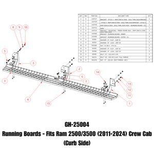 Upgrade your Ram 2500/3500 (2011-2024) Crew Cab with durable steel running boards. Featuring a criss-cross anti-slip design, 84" length, 400 lb. capacity, and a tough black powder coat finish. Built for strength and proudly made in America. Catalog