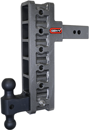 GEN-Y's Mega-Duty Adjustable Drop Hitches start at 10,000 LB towing capacity and go up to 32,000 LB towing capacity. There are multiple drop options as well depending on your trailer towing needs. Catalog Datasheet