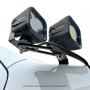 The Dogbone Light Mount bracket allows for an extra 3" X 3" industry standard dual cubes LED, driver and passenger brackets that attach to XE Hood Hinge Mounts. Light Mount Brackets come with a Limited Lifetime warranty on materials and construction and a 5 year warranty on the Textured Black Finish. Installation Instructions