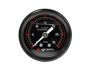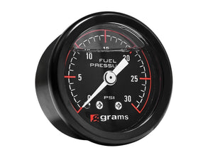 Compliment your fuel regulator with the Grams fuel pressure gauge. These easy to read, matte black stainless steel gauges measure 0-30 psi (2.06 bar) and are glycerin filled to accommodate applications with the highest vibrations. While adjusting the regulator, the Grams Fuel Pressure Gauge will provide you an accurate fuel pressure reading at a glance.