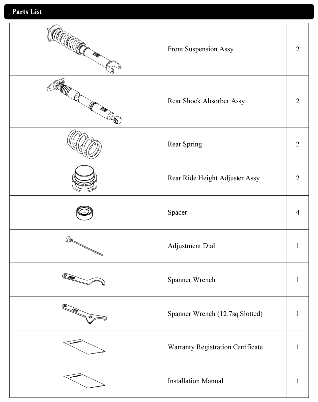 *1. Height from road surface to fender arch. *2. Height at factory is the data tested at HKS with the setting of Full Kit. (HKS' recommended setting.) *3. Adjustable range (However, the lowest value may not be road legal. Even within the adjustable range, car body, arm etc. may contact. In such case, it will be hard to drive. Damper oil leakage or any other problems caused by low ride height setting from the factory setting will void the warranty of the product.) *4. Drivable range that there is no contact of car body or arms etc. (However, change of tire/wheel size may cause a problem.) Caution). Actual data depends on each vehicle. |