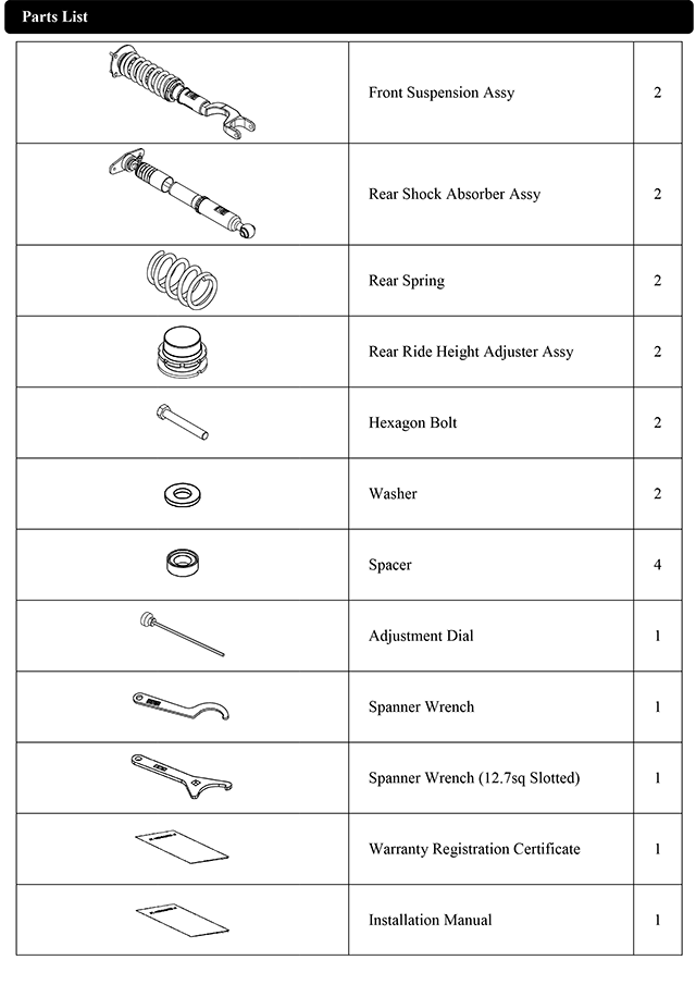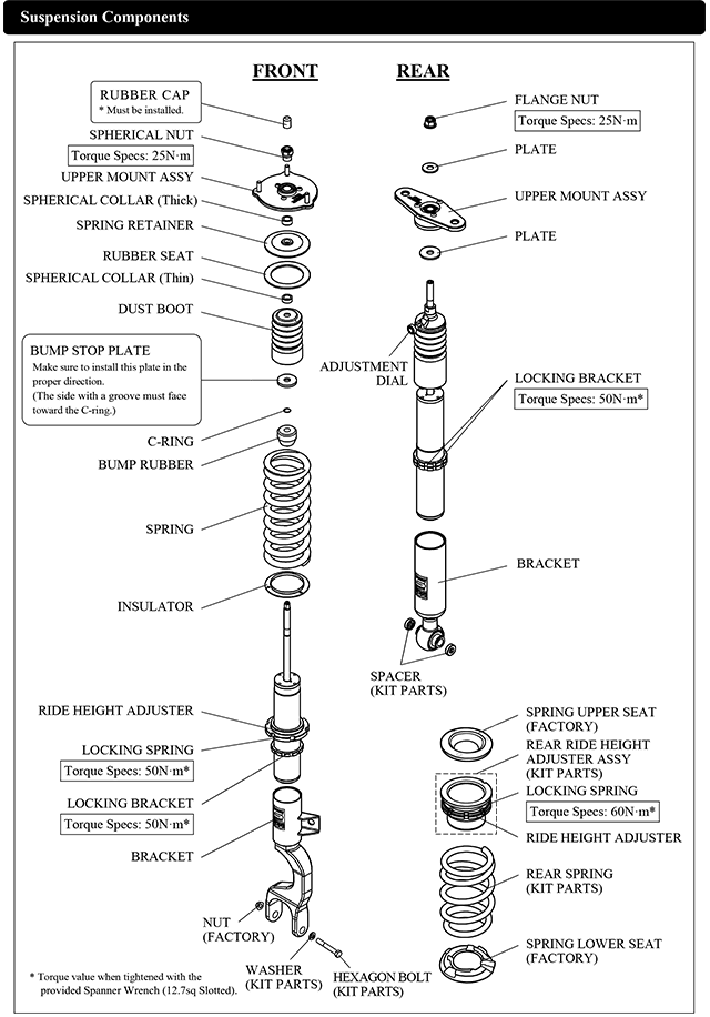 Damper oil leakage or any other problems caused by low ride height setting from the factory setting will void the warranty of the product.)