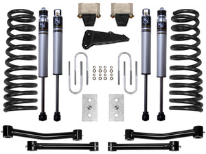 2009-2012 Ram 2500/3500 4.5" Stage 1 Suspension System utilizes the same technology as the 2.5" systems while adding lift height and ground clearance. Additional engineered front end components are added to ensure proper steering geometry with improved function throughout the entire travel range whether on or off road. The Stage 1 System is comprised of dual rate coil springs, tubular steel upper & lower link arms, polyurethane bumpstops w/ billet extension, sway bar drop brackets, forged pitman arm, track bar drop bracket, rear 2.5" lift blocks with u-bolts, and 2.0 Aluminum Series smooth body shocks. ICON steel upper & lower links increase performance, strength, and range of alignment. These link arms decrease the bind found in the factory link bushings. This entry level system with billet link arms is great for towing, rough construction site terrains, and country dirt roads all while keeping a smooth highway feel. Installing this kit allows proper clearance for 35" tall tires with no modifications, and some 37" tires with minor fender well trimming for clearance. With the endless hours ICON has spent testing and tuning our suspension components and shocks together, you can rest assured you have the best suspension solution on the market.