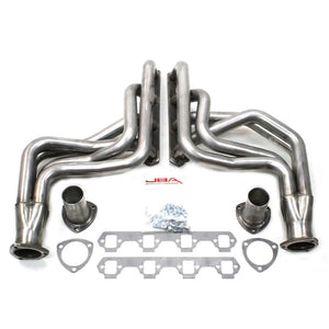 JBA long tube headers are the number one choice for maximum performance gains and high RPM efficiency. Available in 409 or 304 Series Stainless Steel. These long tube designs are dyno and race proven to deliver the greatest possible increase in horsepower and torque throughout the RPM range. All JBA long tube headers feature large mandrel-bent stainless steel primary tubes, oversized exhaust ports, extra thick 3/8 one-piece flanges, and proprietary JBA Firecone® merged collectors for smooth flow. Each system is designed to give the maximum amount of ground clearance possible, so lowered cars do not drag the collectors.