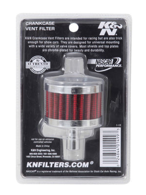 K&N crankcase vent filters are perfect for racing applications, vintage cars or individuals who want to add some aesthetics to their classic carbureted engine. The 62-1015 crankcase vent filter has a K&N embossed chrome-plated steel top with a chrome-plated steel base. The 1/2 inch diameter zinc tube is designed to push in and clamp directly on to metal or plastic tubing where venting is needed. Constructed with a synthetic filter media it can be cleaned and reused repeatedly. Note: Legal in California only for racing vehicles which may never be used, registered, or licensed for use upon a highway. See knfilters.com for CARB status on each part for a specific vehicle.