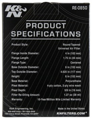 K&N Universal Air Filter (4in. Flange / 6in. Base OD / 4-5/8in. Top OD / 6in. Height) - RE-0850