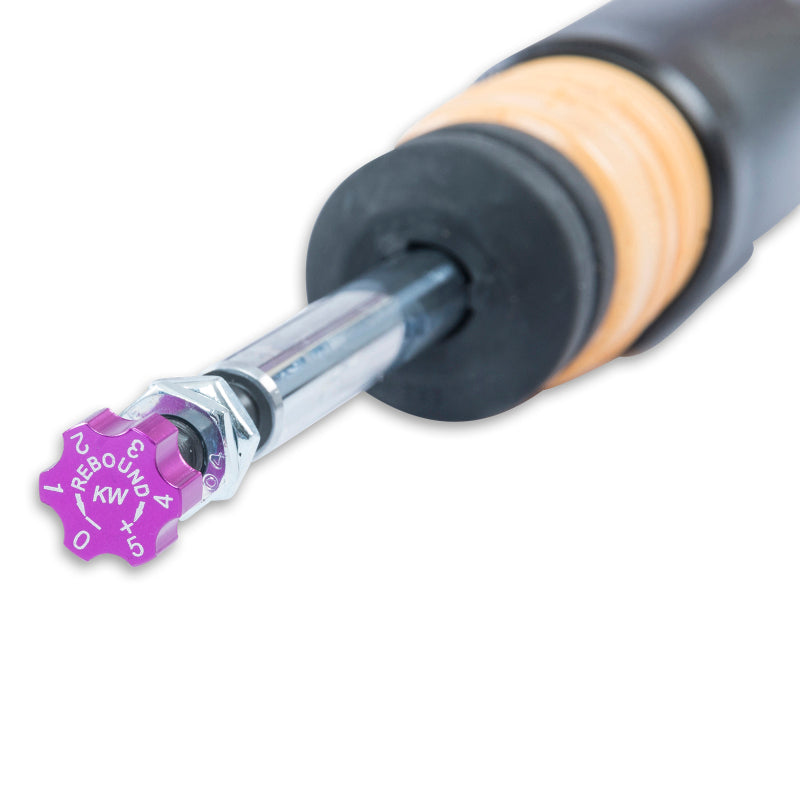 KW V2 INOX-LINE coilovers are the perfect solution for drivers who want more than just outstanding looks and adjustable ride height. In addition to stainless steel coilover struts, and corrosion-resistant components built for long term durability, KW V2 coilovers utilize TVR-A (Twin Valve Rebound - Adjustable) technology that allow Adjustment of the rebound damping characteristics with 16 clicks so you can fine tune the ride comfort or performance to your satisfaction. As with all KW coilovers our engineers develop vehicle specific damper settings that undergo comprehensive testing on the Nurburgring Nordschleife and in our KW 7-post Driving Dynamic Test Center. With a KW coilover kit the driving experience is more dynamic and direct. With the rebound adjustability you have a more direct influence on the handling or comfort of the car. With 16 precise clicks you can adjust the KW dampers (more firm or more comfortable) without affecting the compression damping fine-tuned by our engineers. The two-stage, patented TVR-A (Twin Valve Rebound - Adjustable) technology enables a small volume of oil flow through an adjustable, conically shaped, low-speed bypass during low damper speeds, while at high damper speeds, the main rebound stage valve opens allowing a larger volume of oil to flow. This provides a big improvement in terms of ride comfort without influencing the high-speed range. There are 16 precise clicks available for individual settings, so you can choose between more comfort or more body control. With KW V2 coilovers you can achieve maximum lowering within an approved lowering range that ensures a proper functioning suspension and adequate travel after your car is lowered. Even after years of use you can easily adjust the ride height thanks to the dirt resistant trapezoid thread and composite adjustment collar.