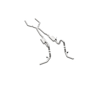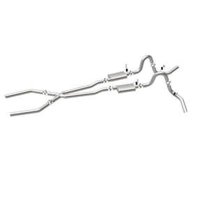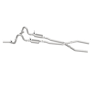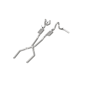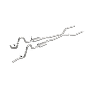 The MagnaFlow Street Series Crossmember-Back Performance Exhaust System 15897 brings enhanced engine sound and dyno-proven performance to your muscle car with a healthy helping of our deep, resonant signature exhaust note at Aggressive exterior and Moderate interior sound levels. Thanks to its durable, corrosion resistant stainless steel design, this exhaust system will handle whatever tarmac you decide to leave your mark on. This performance exhaust kit features a crossmember-back layout designed to replace your exhaust system from the crossmember on back. With its fast-flowing, mandrel bent 3in. main piping and 2 Straight-Through mufflers ending in a Dual Split Rear Behind Rear Tires exit that you can enhance with tips of your choosing, your muscle car will be sounding as awesome as it looks. Extensive 3D scanning during development has resulted in a direct-fit design that you can easily install yourself. 15897 is produced using CNC precision robotic manufacturing techniques and is backed by MagnaFlow's limited lifetime construction warranty.