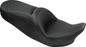 This seat offers rider and passenger the comfort of a touring seat with a sporty, stylish look. Plants the driver in a similar position to stock, with a nose narrower than stock so riders can more easily plant their feet on the ground. The baseplate is open in the middle to accept a stock H-D or Mustang driver backrest kit.
