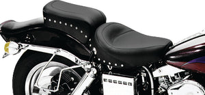 This Standard Touring seat features a full 12" front bucket for the rider with slightly raised back to eliminate sliding back while offering reasonable lumbar support. The seat is trimmed with a braided edge skirt that comes down over the frame and fender for a clean look. Two-Piece Seat foam is on a single-piece steel base that quickly bolts on using stock locations.