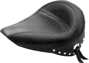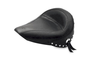 Mustang's standard touring solo offers a 14" wide driver seat with deep bucket styling for back support and to keep riders from sliding back. Both the original and studded styles are trimmed with a braided edge skirt for a classic clean look. Available with or without a fully adjustable and easily removable driver backrest. The 8" wide passenger seat extends forward slightly for increased driver back support on solos without driver backrest, while Recessed Passenger seats are designed to allow adjustability of the built-in driver backrest.