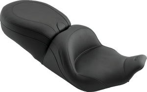 This "LowDown" Touring seat sits the driver 1.5" lower than the stock seat, plus the nose of the seat is 1.5" narrower than stock. Now the driver can have a comfortable seat and still plant his or her feet safely on the ground. The 16.5" wide front bucket and the 14" wide rear seat are available plain or with black pearl centered studs. Available with or without a fully adjustable and easily removable driver backrest.