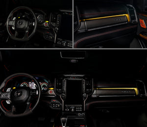Unimpressed with the dim white light in the dash of your new RAM truck or looking for an easy way to add unique style to the vehicle's interior? With the new ORACLE Lighting Interior Ambient Lighting ColorSHIFT(tm) RGB Kit for the 5th Gen RAM, you can turn the boring stock interior lighting into a vivid color accent with full smartphone control! This kit is the perfect way to accent your interior cleanly and seamlessly. With an easy-to-use smartphone app, your new RAM RGB dash lights to be any color imaginable for a style that's all your own. Our RAM interior ambient lighting kit uses high-powered ColorSHIFT(tm) RGB circuit boards that replace the existing factory circuit boards. Easily connect to our included RGB Bluetooth controller via plug-and-play connections. Connect the controller to the cigarette lighter adapter in the dash using the included connectors, and you can control the lights using the free app on your smartphone. Using the app, you have full control of the hundreds of colors, patterns, and brightness levels. Our cutting-edge RGB interior ambient lighting kit for 5th Gen RAMs is a great way to personalize your ride with show-stopping looks and industry-leading performance. Stand out with new, modern LED styling with ORACLE Lighting!