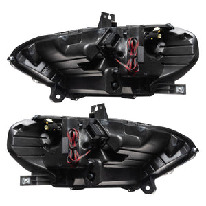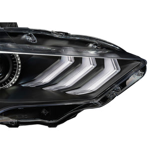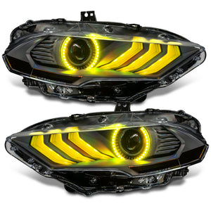 The new Mustang DYNAMIC ColorSHIFT headlights from ORACLE Lighting are complete replacement headlights that pack a TON of innovative features such as Blacked-Out Housings, Sequential FLOW Turn Signals, and Smartphone Control all in one package! Dynamic ColorSHIFT RGB+A headlights feature individually addressable LEDs which pack a ton of unique features. The Dynamic features allow the user to run multiple moving color patterns through the LEDs, creating a vivid eye-catching lighting effect. The new RGB+A (RGB+ Amber LED) SWITCHBACK line-up features Amber LEDs creating the exclusive Dynamic FLOW turn signal effect. The "BLACK-SERIES" headlights feature a Matte Black Housing, Satin Black Bezel, and Smoked Marker Light for a dark and aggressive overall styling. Designed to enhance the look without compromising its safety and functions. These complete headlights feature: Dynamic Halos and Dynamic Tri-Bar DRLs and includes everything needed for installation. No need to swap over any bulbs or ballasts these are COMPLETE LED headlights! Wiring is now easy with the plug-and-play connectors. Simply plug the halos into the LED driver and connect to + and ? to the battery. Then you just turn on the app and connect to the controller. Conveniently controlled through a free smartphone App, the system features over 200 pre-programmed moving patterns as well as static color control and white DRL mode for normal street driving. In addition to the pre-programmed features the user can also create custom designs through pixel editing in the app. Through the App you can easily make standard white colors as well as any static colors using the LED color wheel. What makes these DYNAMIC halos more unique is that you can also display a variety of moving patterns within the app. With over 200 different patterns there is something to fit every color scheme you can imagine!