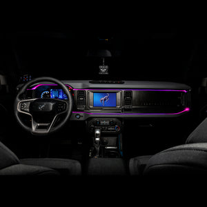 ORACLE Lighting's new Fiber Optic Interior Kits are the perfect way to accent your vehicle's dull interior in a clean and seamless way. The special side-firing fiber optic cables have an integrated edge to make installation easy on your Ford Bronco! Using the included installation tool, insert the integrated edge between interior body panels in your vehicle including door panels, dashboard, headliner, console, and more. The power cord adapter has a switch to turn ON and OFF the lights conveniently. The fiber optic is end lit by a LED light head. We recommend that for any length over 3', you end-light both ends of the cable for the best and brightest look. The light travels through the fiber and lights up smoothly along the way for a very clean and understated appearance. The integrated edge is designed to hold the fiber optic cable tightly without the use of any adhesive. Our ColorSHIFT(tm) option comes with a remote that allows you to select the exact color you want to use, adjust the brightness, and even do different effects like pulse, strobe, and smooth color transitions. You can also control your fiber optic interior kit using the free app called Available for Android and IOS.