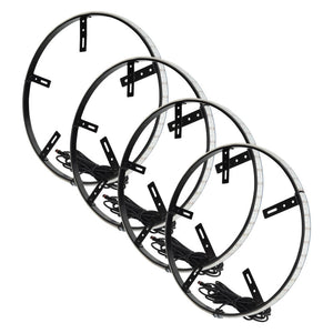 ORACLE Lighting illuminated LED wheel rings are an easy and effective way to light up the wheels on your car or truck! This head-turning lighting product consists of a set of (4) LED illuminated aluminum rings which install around the brake rotor and attaches to the brake dust shield. These can also be mounted to older vehicles with drum brakes. The effect is a large ring of light which accents custom wheels and stands out at events. Oversized 16.5" diameter is the largest on the market and fits oversized brakes. This kit now features a TRUE white 6000K from separate white LEDs for a TRUE WHITE output for a Crisp & Clean white light. Change Colors, Control Brightness, access strobing patterns, and sync with music! Now featuring Dual-Control allowing the user to use both the free Bluetooth Smartphone App control PLUS the included Wireless Remote Control. Installation is easy with waterproof Plug & Play Connectors that easily connect the individual rings to the central control box. Battery connection leads include ring terminals and in-line fuse for simplified wiring installation. There is also a pre-wired On/Off switch that can be used to manually turn the system on and off for maximum control. Additional upgrades to our LED wheel lights include thicker aluminum rings, black powder-coat anti-corrosive finish, waterproof connectors, and pre-installed brackets. Installation tip: For extra security of the screws holding in the brackets on wheel rings, first confirm that the wheel rings' brackets are in the correct mounting location. Then, apply an appropriate amount of Loctite to these screws to ensure a firm hold. If your vehicle is equipped with drum brakes or does not have a brake dust shield you will need to perform additional fabrication of brackets to fit properly. Please note, these rings are not intended for use while driving.