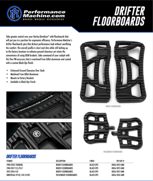 Take greater control over your Harley-Davidson® with floorboards that will put you in a position for ergonomic efficiency. Performance Machine's Drifter floorboards give that distinct performance look without sacrificing the comfort. The overall profile is short and slim while still bolting up to the factory locations to enhance ground clearance yet retain the convenience of using OEM brackets. Take command of your cockpit with this fine PM accessory.
