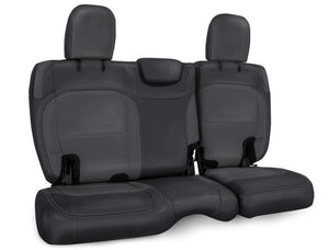 PRP's Seat Covers for the Jeep Wrangler JL bring a whole new look to your interior. These covers have been expertly crafted to fit perfectly over your factory JL seats providing an OEM fit and finish. Install yourself or through a certified PRP installer. Made from durable marine-grade vinyl, they can handle the abuse from both on and off-road environments. The covers install over your stock upholstery, and are side impact airbag compatible. Two different models are available depending on your vehicle's original interior. Vehicles with original leather interiors feature a fold down arm rest in the center of the bench. Vehicles with original cloth interiors do not have an arm rest.