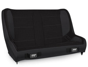 The Elite Series Bench features modern styling, and large harness openings that allow for a better fit and easier adjustment. Built for off-road, this bench provides better comfort and containment than stock. The styling of this Elite Series bench matches the styling of our other Elite Series seats, so you can match the exact look of your front seats. The bench can comfortably fit 2 adults, and is built 3" shorter than our standard to allow for more leg room (23" deep - front to back). This low-back version does not feature headrests. Available in 5 pre-designed color combinations. All Black - Black, 201, 50, 210, 210; PRP Silver Out - Tweed in the Center, with Vinyl on the Arms and Back Built at 36" width to fit into Jeep Wrangler CJ7 or YJ. Attach to your vehicle by bolting to the pan with our Universal Angle Mounts - 3" Short. Fits in the back of your Jeep Wrangler CJ7 / YJ Measures 36” wide Mounting Area: 30? Wide x 15? Front to Back 24" Tall x 23” Deep