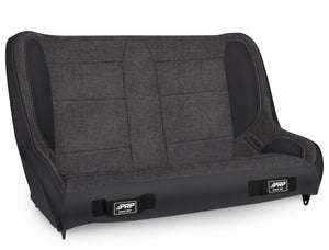 The Elite Series Bench features modern styling, and large harness openings that allow for a better fit and easier adjustment. Built for off-road, this bench provides better comfort and containment than stock. The styling of this Elite Series bench matches the styling of our other Elite Series seats, so you can match the exact look of your front seats. The bench can comfortably fit 2 adults, and is built 3" shorter than our standard to allow for more leg room (23" deep - front to back). This low-back version does not feature headrests. Available in 5 pre-designed color combinations. All Grey - Black, 202, 54, 210, 210; PRP Black Out - Tweed in the Center, with Vinyl on the Arms and Back Built at 36" width to fit into Jeep Wrangler CJ7 or YJ. Attach to your vehicle by bolting to the pan with our Universal Angle Mounts - 3" Short. Fits in the back of your Jeep Wrangler CJ7 / YJ Measures 36” wide Mounting Area: 30? Wide x 15? Front to Back 24" Tall x 23” Deep