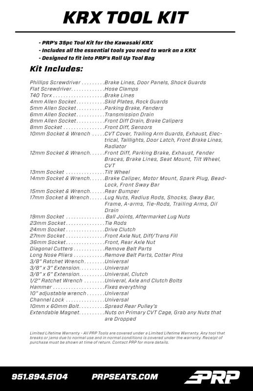 PRP's Kawasaki KRX Roll-Up Tool Kit provides everything you need to fix your Kawasaki Teryx KRX or KRX4 out on the trail. This 35 piece kit includes a selection of high-quality ratchets, sockets, wrenches, extension bars, pliers, and a ball peen hammer (for when things get really fun). We've hand picked the exact tools that are needed most when working on a KRX - So you have only the essentials that you really need, without adding the extra weight of an entire tool box. Below we have listed all the tools included, along with a handy guide to the most common uses for each tool. Each tool also includes a Limited Lifetime Warranty. The Roll-Up Bag makes it easy to keep everything neat and organized. It features dedicated sleeves for all the tools included in the kit, as well as a zippered pocket to hold the sockets and any other tools you want to bring with you. The bag is made from extremely durable twill material. It features heavy duty buckles, and an easy to carry grab handle. It can be mounted, or stored securely inside the vehicle. The roll-up style bag makes it quick and easy to grab out of the vehicle when you need it, and the tools inside don't make noise when bouncing around the trails. Don't get caught out on the trail unprepared. PRP's Roll-Up Tool Kit has everything you need to get your Kawasaki Teryx KRX going! Fitment: Kawasaki Teryx KRX & Kawasaki Teryx KRX4 KIT INCLUDES: ALLEN Sockets 4mmx3/8 - Skid plate, rock guards 5mmx3/8 - Parking brake, fenders 6mmx3/8 - Transmission drain 8mmx3/8 - Front diff drain, brake caliper TORX BITS- Sockets T40x3/8 - Brake lines SOCKETS/WRENCHES 8mmx3/8 - Front diff, sensors 10mmx3/8 - CVT cover, trailing-arm guards, exhaust, electrical grounds, taillights, door latch, front brake lines, radiator 10mm End Wrench 12mmx3/8 - Front diff, parking brake, exhaust, fender braces, brake lines, seat mount, tilt wheel, CVT 12mm End Wrench 13mmx3/8 - Tilt wheel 14mmx3/8 - Brake caliper, motor mount, spark plug, bead lock