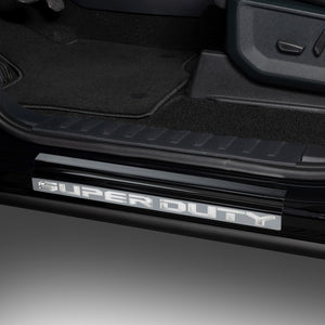 Protect your Ford's door sill from damage, in style, with the Officially Licensed platinum black Ford logo stainless steel door sills.  The black door sill trim plates are manufactured out of polished T-304 stainless steel, and polished to a mirror-like finish. In addition, this top-shelf item Featuring Laser-etched logos like Super Duty, Ranger, F-150, Maverick, or Bronco, Custom-crafted to flawlessly fit your Ford, these door sills seamlessly integrate, giving your vehicle the high-end, expensive appearance that it deserves.The Installation is a breeze, thanks to the pre-applied automotive-grade 3M tape. Simply peel, align, and stick! Since each product is designed and manufactured in the USA, they are backed by the NeveRust limited lifetime warranty, guaranteeing exceptional durability and long-lasting performance.Protect your Ford's door sill from potential damage while enhancing its overall aesthetic appeal by adding a touch of refinement that your Ford deserves!
