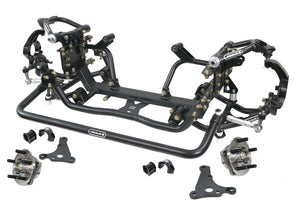 Front suspension system with hub spindles for 1965-1979 F-100, 2WD. Includes, cross member, frame brackets, upper and lower arms, spindles with S550 hubs, caliper brackets, tie rods and sway bar. For use with Shockwaves or Coil-Overs.