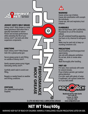 RockJocks premium quality, long lasting grease has be proven in all of our own competition and recreational vehicles over the last 15+ years. Non-moly and synthetic greases eventually dry up and cause squeaking, friction and component wear. We only use moly grease for maximum longevity and smooth quiet operation of components. RockJock grease is a high-moly based petroleum lubrication that is specially formulated to reduce friction and increase performance while extending the life of our Johnny Joint Rod Ends as well as all of our steering system rod ends and anything greased via our greasable bolts, such as our Heavy Duty Leaf Spring Shackles.