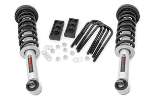 Need a new look? How can you lift, level, and personalize your truck all at the same time? With Rough Country's 2.5-inch Leveling Kit for your Ford F-150 Tremor! This powerful leveling kit is designed to eliminate the nosediving effect and improve stance and look while retaining ride quality. In addition, our leveling kit offers a boost in ground clearance while allowing you the ability to run 35 x 12.50 tires on OE wheels without any trimming. So, you get a whole new height to look from, along with better undercarriage protection.\Durability with Style. Rough Country's F-150 Tremor Leveling Kit consists of Rough Country's N3 Performance Lifted Struts and durable rear blocks. Our Nitrogen charged, loaded struts add ride height to your truck while maintaining a smooth, factory-like ride. Each strut includes a pre-loaded coil for lightning-fast installation without the need for complicated strut disassembly. Each strut also features a silver powder coat finish for a rugged style and durable performance. This kit raises the front of the vehicle 2.5-inches, and the factory rear blocks are replaced with our heavy-duty proprietary composite material blocks to achieve a level stance, providing a perfect balance between appearance and functionality.\Installation and Warranty. Our 2.5in Leveling Kit for your Ford F-150 Tremor is an easy, bolt-on installation. The kit comes with Rough Country's industry-leading limited lifetime warranty.