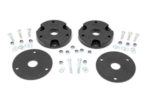 Level your Chevy Silverado or GMC Sierra 1500 from front to rear while giving your truck a more aggressive look with Rough CountryΓÇÖs 2-inch Leveling Kit! GM trucks come with a factory rake, leaving the rear much higher than the front. This simple solution raises the front to match the height of the rear, providing a more aggressive appearance and enough increased ride height to run larger tires and wheels.\DonΓÇÖt limit your new truck! Rough CountryΓÇÖs GM 1500 Leveling Kit features an upper-strut spacer design which is designed to improve CV boot clearance compared to bottom mount spacers. This design offers better clearance for off-road driving so you can tackle uneven terrain with greater peace of mind. Best of all, Rough CountryΓÇÖs 2-Inch Leveling Kit is designed to retain your vehicleΓÇÖs smooth, factory ride quality.\Give your Silverado or Sierra 1500 the aggressive look it deserves with a Rough Country leveling kit. Includes a Lifetime Replacement Guarantee!