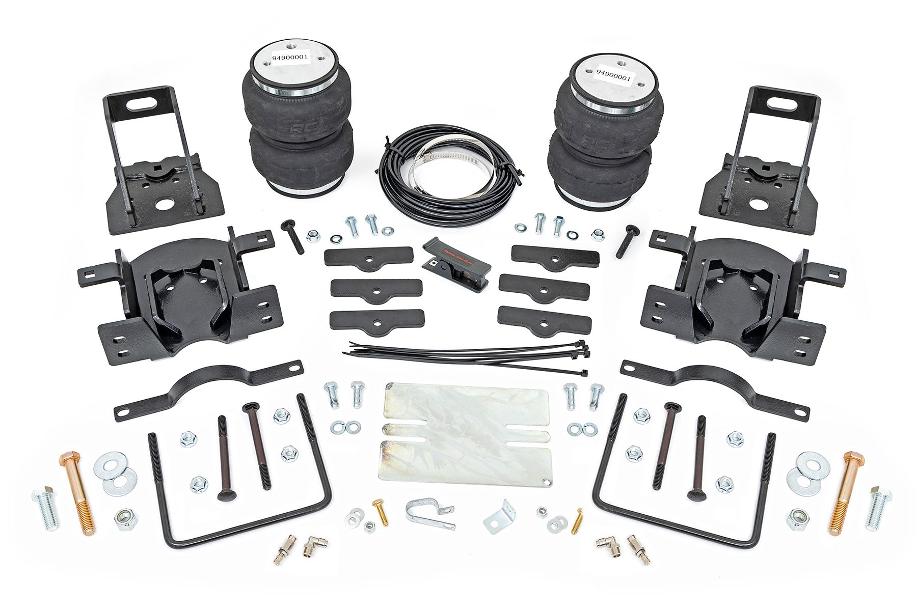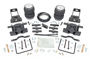 Ideal Leveling. Is your truck your workhorse? The main attraction to the pick-up line is the accessibility to haul and tow as desired. However, due to the amount of weight in the bed, or the condition of the vehicle's rear leaf springs, this can cause the vehicle to be un-level when under load. Here at Rough Country, we created an innovative new product to ensure that these are troubles of the past. Introducing, Rough Country's Rear Air Spring Kit.Heavy-duty Construction. Rough Country's Rear Air Spring Kit features two RC branded high-quality double convoluted airbags complemented with DOT-approved airlines. Whether you plan on towing or hauling in the not-so-distant future Rough Country's Air Spring kit is the must-have accessory to ensure that your trailer is level reducing the weight off of the tongue of your trailer.  Each kit offers 1/4" push connector fittings and all of the bracketry needed to ensure installation is lightning fast and secure! Rough Country's Air Spring kit provides up to 5,000 lbs of load support to ensure that you experience less sway and bottoming out when braking and steering! \Installation. With an estimated timeframe of 1-2 hours this full kit can be installed at home using standard tools and can be completed efficiently and quickly!\Limited Lifetime Replacement Warranty. Rough Country's Rear Air Spring Kit is backed with a limited lifetime replacement warranty towards manufacturer defects. As such, the product is protected from structural and workmanship damage after the date of purchase. With our industry-leading warranty give yourself peace of mind when using Rough Country's Suspension products!