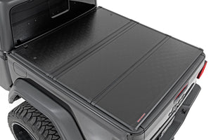 Rough Country's Tri-Fold Tonneau Hard Cover gives you a practical way to protect your truck bed with a durable, segmented hard cover that keeps weather and thieves at bay.This UV protected hard cover features three rigid aluminum panels with a premium, black textured finish for uncompromised protection and killer good looks. The convenient triple-fold design allows you easy access to your bed or the ability to haul large items without entirely removing the cover. Just fold back one or two sections as needed to access the bed, or roll it all the way up and attach the durable storage straps and continue along your way with the cover in the open position.With a lightweight design and no tools required, installation is a snap. Your cover will arrive completely assembled and ready to install. Simply line up and fasten the quick-clamp locks and you're ready roll in seconds.Each Tri-Fold Hard Cover comes with a Limited Lifetime Warranty.