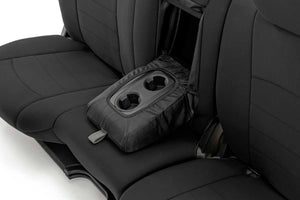 Want to protect your seats or are your seats showing signs of wear and tear from daily use? Say goodbye to unsightly stains and deterioration with Rough Country's Neoprene Seat Covers - the ultimate solution for preserving your vehicle's interior. Snug Fit for Optimal Protection: Our seat covers are tailored to fit your seats perfectly, providing a protective barrier against spills, scratches, and everyday wear and tear. Factory-Spec Construction: Engineered to meet factory specifications, our covers blend seamlessly with your vehicle's interior, giving it a fresh, new look without compromising on quality or style. Four-Layer Defense: With a four-layer construction featuring foam padding and a durable polyester shell, our seat covers offer unmatched protection and longevity, ensuring your seats stay looking new for years to come. Breathable and Water-Resistant: The neoprene layer not only provides breathability for added comfort but also boasts water-resistant properties, safeguarding your seats from spills and stains. Complete Coverage: Our covers come with full protection for your front seats, including headrest covers where applicable, as well as rear covers to shield your back seats from children and pet-related mishaps. Peace of Mind Warranty: Rest easy knowing your purchase is backed by our two-year warranty, giving you confidence in the durability and reliability of our product. Don't let worn-out seats diminish your driving experience. Upgrade to Neoprene Seat Covers today and enjoy a fresh, stylish interior that's protected against the rigors of daily life on the road.