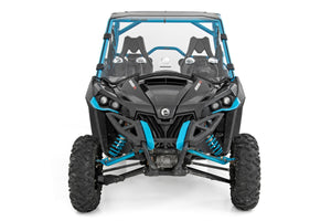 Added Protection and comfortability. Protect the occupants of your Can-Am Maverick from off-road hazards such as rocks, branches, and other debris with Rough Country's Scratch-Resistant Windshields. UTV Windshields offer a clear visual of the trail ahead and allow for a much more comfortable outing!\High-Quality Polycarbonate Construction. Rough Country UTV windshields are constructed from thick polycarbonate material that is precision cut for a perfect fit. The polycarbonate material provides an ideal combination of clarity, flexibility, durability that outperforms glass, acrylic, and other windshield materials.\Durable Scratch and UV Resistance. Each windshield is not only constructed from thick polycarbonate material but enhanced by a secondary AR2 hard-coating process. This process completely coats the windshield with a hardened, scratch-resistant barrier. This treatment also provides the additional benefit of UV protection.\Easy Installation. With a simple strap-on installation process, installing a Rough Country windshield couldn't be easier. Within 15 ΓÇô 30 mins you can be ready to hit the trails.\Limited-Lifetime Replacement Warranty. Rough Country's Scratch-Resistant Windshields are backed with a limited lifetime replacement warranty towards manufacturer defects. As such, the product is protected from structural and workmanship damage after the date of purchase. With our industry-leading warranty give yourself peace of mind when using Rough Country's Suspension products!