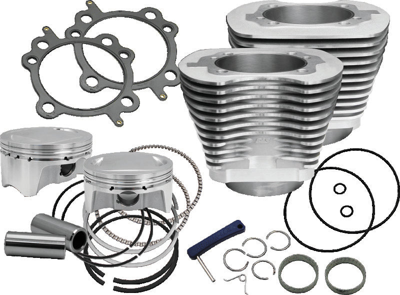 This bolt-in big bore kit is easy to install, and requires no machining or rebalancing. This is the largest bore (3.937") that can be fit in a stock engine case. Stock engine height is maintained so there are no manifold or frame fitment issues. The S&S 11 fin cylinder design closely resembles OEM shape and come prefinished - ready to install. Cylinders feature increased fin area for better heat dissipation, and the centrifugal cast, gray iron liner features 40,000 psi tensile strength for superior wear and performance. The pistons in this kit have a 3cc pop-up dome for slightly higher compression rato. This is one reason to choose and S&S 107" kit over the S&S 106" kit which has slightly less compression.